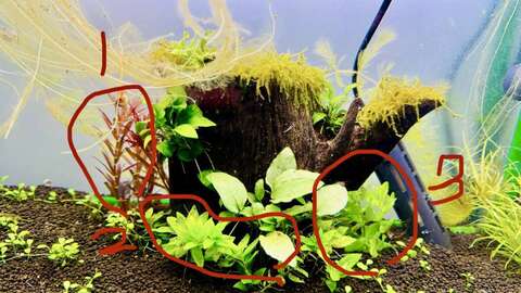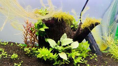 1.ロタラ ロトンディフォリア ブラッドレッド, 2.追加のストロギネレペンス, 3.ウォーターバコパ を追加しました。本当は完全に切り株の後景に植えたかったんですが、水流が強すぎて植えられず。やむを得ず少しずつ左右に散らして植えてみました。あとは、エアポンプの設置をすればエビ受け入れ準備完了というところ。