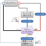 USB充電は約2年間特に問題なく動作していて、回路の間違いは全く疑っていなかったのでびっくり。記事を読んでも、何がまずかったのか今一つ分からなかったので、何かまずいのか友人に聞いてみたところ「配線自体は問題ないけど、バッテリーのプラスから出ている線にはヒューズをつけた方がいいね」と知恵袋の中の人と同じ回答。